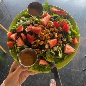 Arugula, seasonal Berries, Goat Cheese, Cranberries and Spiced Nut Mix withMango Vinaigrette –